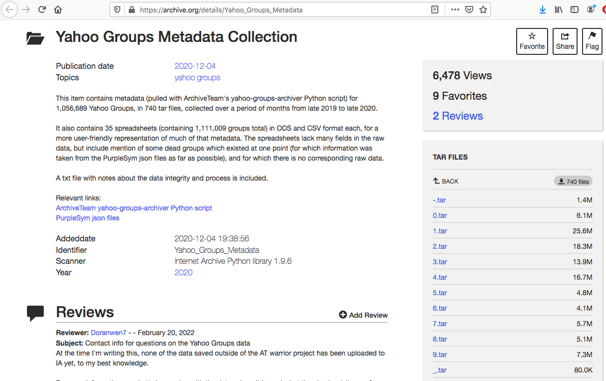 De tods formas, es necesario decir que han habido inciativas para “salvar” gran parte de lo que había en Yahoo Groups que surgieron gracias al trabajo en conjunto entre la misma comunidad y el grupo Archive Team. El resultado de ese proyecto puede encontrarse en el llamado Yahoo Groups Metada Collection alojado en Archive.org.